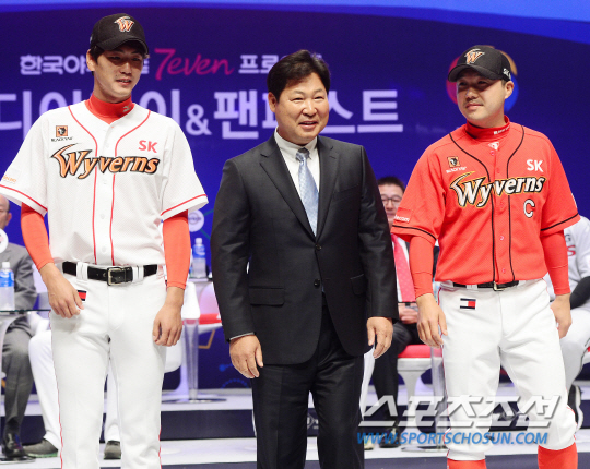 2014 프로야구 미디어데이&팬페스트가 24일 서울 이화여자대학교 ECC 삼성홀에서 열렸다. SK 이만수 감독과 김광현, 박진만이 무대에 올라 인사하고 있다. 지난 2012년부터 대학캠퍼스에서 열린 프로야구 미디어데이는 꾸준히 증가하는 여성 관객에 대한 팬서비스를 위해 이화여대에서 개최됐다. 이날 행사에는 9개 구단 감독과 대표 선수들이 참석해 팬사인회와 공식행사를 가졌다. 정재근기자 cjg@sportschosun.com