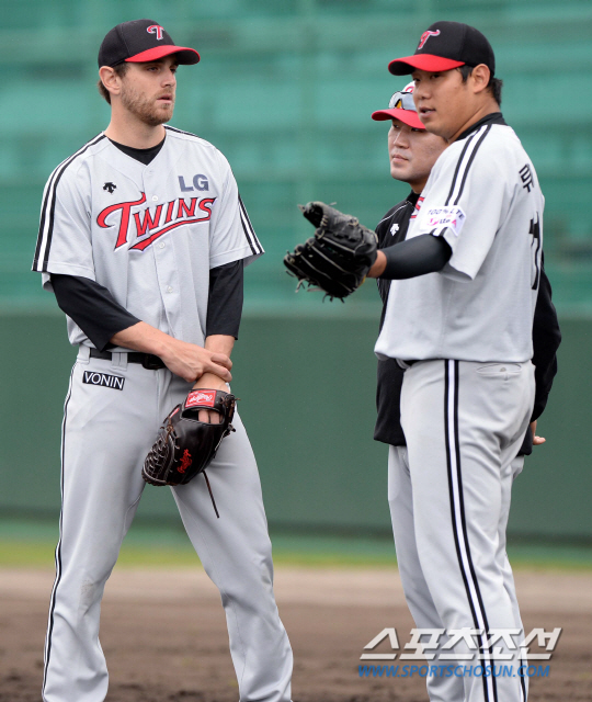 LG 트윈스 선수단이 일본 오키나와 이시카와 구장에서 전지훈련을 펼치고 있다. 19일 진행된 훈련에서 수비훈련을 하던 리오단이 류제국과 이야기를 나누고 있다. 미국 애리조나 전지훈련에서 체력 강화와 컨디션 올리기에 초점을 맞춘 훈련을 펼쳤던 LG는 일본 오키나와 전지훈련에서 타격과 수비 훈련에 집중하며 각 구단과 연습경기를 가질 예정이다. 오키나와(일본)=허상욱 기자 wook@sportschosun.com/2014.02.19/