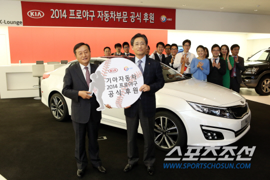 한국야구위원회(KBO)는 25일 서울 압구정동 기아자동차 사옥에서 2014 한국야쿠르트 세븐 프로야구 자동차부문 후원 조인식을 가졌다. 기아자동차는 올 시즌 프로야구 주요경기에 시구차량을 제공하고, 올스타전 MVP(K5), 페넌트레이스 MVP(K7), 한국시리즈 MVP(쏘렌토 후속)에게 각각 기아자동차를 증정하는 등 KBO와 함께 프로야구를 통한 다양한 연계 마케팅 활동을 선보일 예정이다. 이날 조인식에는 KBO 양해영 사무총장과 기아자동차 김창식 국내영업본부장이 참석했다.