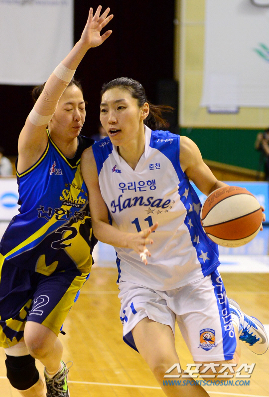 25일 춘천호반체육관에서 여자프로농구 챔피언결정전 1차전 우리은행과 신한은행의 경기가 열렸다. 우리은행 임영희가 신한은행 김규희(왼쪽)의 수비를 제치며 돌파를 시도하고 있다. 춘천=송정헌 기자 songs@sportschosun.com/2014.03.25