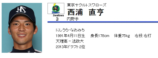 야쿠르트는 니시우라의 안정된 수비를 보고 선발했다. 하지만 그는 이미 대학 시절 4번 타자를 했을 정도로 매서운 타격 솜씨도 보여주었다.