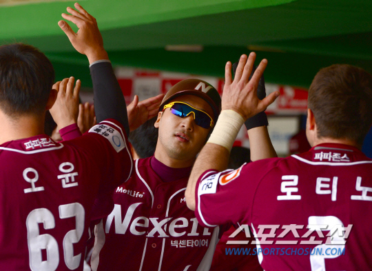 30일 인천문학구장에서 프로야구 개막 2연전 SK와 넥센의 경기가 열렸다. 개막전에서는 넥센이 타격을 앞세워 SK에 8대3으로 승리했다. 1회 1사 1루에서 넥센 이택근이 좌월 투런포를 날렸다. 덕아웃에서 동료들과 하이파이브를 나누고 있는 이택근. 인천=송정헌 기자 songs@sportschosun.com