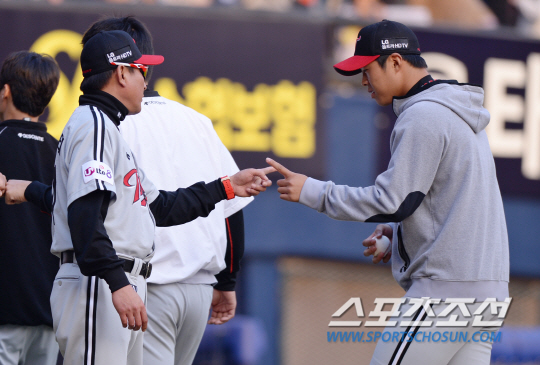 30일 오후 서울 잠실야구장에서 2014 프로야구 LG와 두산의 경기가 열렸다. 14대4로 대승을 거둔 후 LG 김기태 감독이 승리투수 임지섭과 손가락 세리머니를 펼치고 있다. 잠실=김경민 기자 kyungmin@sportschosun.com / 2014.03.30.
