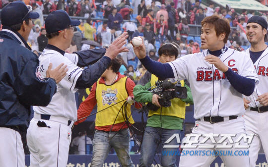29일 오후 서울 잠실야구장에서 2014 프로야구 LG와 두산의 개막전이 열렸다. 5대4로 승리한 후 두산 홍성흔이 송일수 감독에게 첫승 기념으로 마지막 볼을 건네고 있다. 잠실=김경민 기자 kyungmin@sportschosun.com / 2014.03.29.