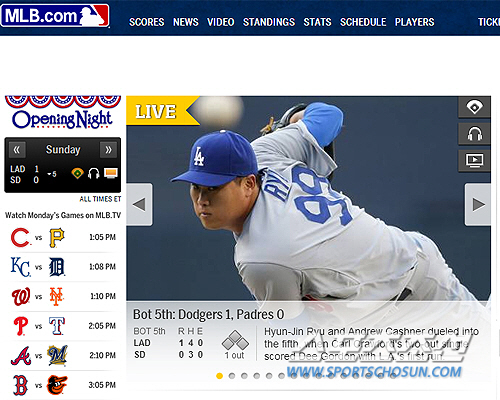 LA 다저스의 '코리안 몬스터' 류현진(27)의 호투가 메이저리그 공식 홈페이지(MLB.com) 메인을 장식했다.