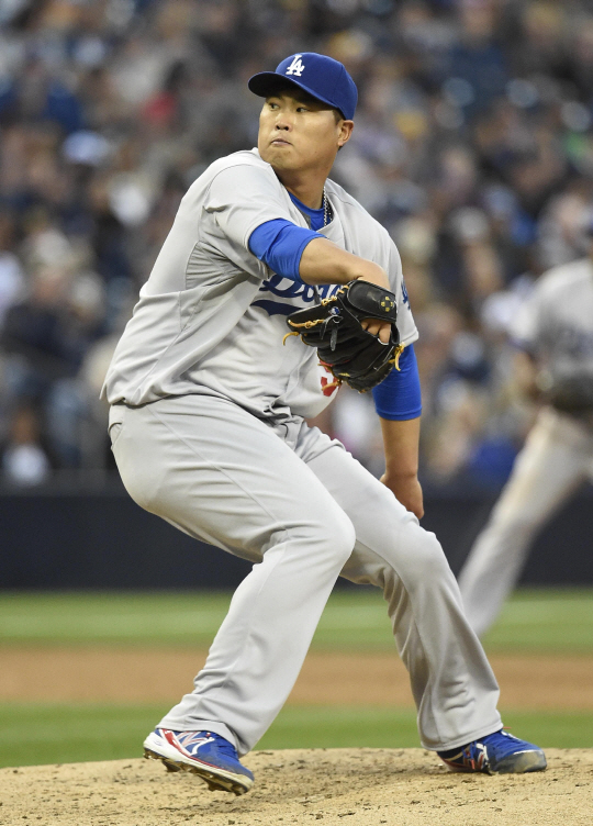 | LA 다저스 류현진이 31일(한국시각) 샌디에이고전서 힘차게 공을 뿌리고 있다. ⓒAFPBBNNews = NEWS1 |