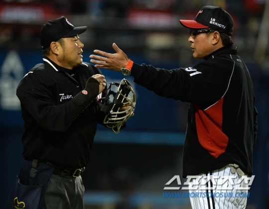 LG와 SK의 2014 프로야구 주중 3연전 첫번째 경기가 1일 잠실구장에서 열렸다. 3회초 1사 2루 SK 조인성의 포수 파울플라이 아웃때 LG 김기태 감독이 그라운드로 나와 이영재 주심에게 이야기를 하고 있다. 잠실=허상욱 기자 wook@sportschosun.com