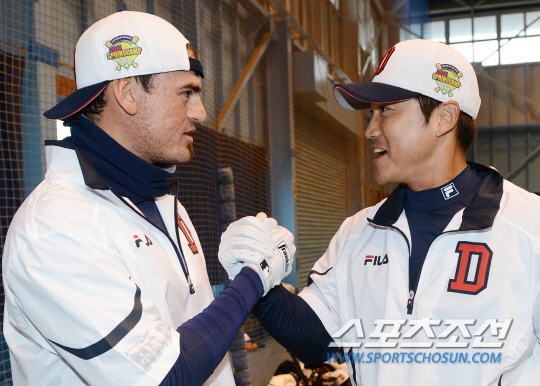 7일 오후 두산 베어스 선수들이 스프링캠프가 차려진 일본 미야자키 기요다케 운동공원에서 훈련을 했다. 팀의 주장 홍성흔이 새 외국인 타자 칸투와 손을 맞잡으며 친밀감을 표시하고 있다. 홍성흔은 미야자키 캠프에서 훈련을 시작한 지 이틀 째인 칸투의 적응을 돕기위해 옆에서 함께 훈련하며 많은 조언을 해주고 있다. 이날 훈련은 비가 내리는 날씨로 인해 투포수조와 야수조가 오전과 오후로 나눠 실내훈련장에서 훈련을 했다. 미야자키(일본)=정재근기자 cjg@sportschosun.com/2014.02.07/