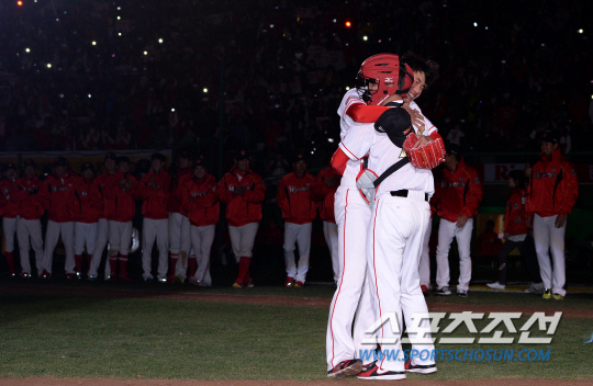 | SK 레전드 박경완이 공식 은퇴식을 가졌다. 박경완은 5일 인천문학구장에서 열린 SK와 한화의 경기를 마치고 '선수 은퇴식 및 영구결번식' 행사를 가졌다. 박경완 감독이 김광현과 함께 2010년 우승의 감동을 다시 한 번 선보이고 있다. 인천=송정헌 기자 songs@sportschosun.com/2014.04.05 |