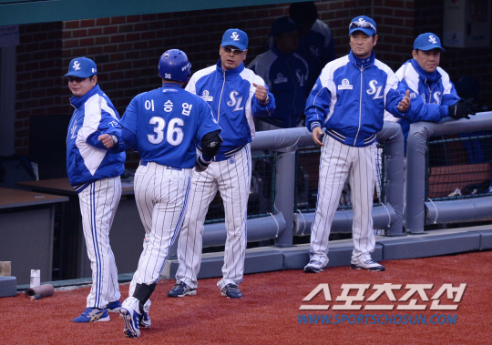 5일 오후 울산 문수야구장에서 2014 프로야구 삼성과 롯데의 경기가 열렸다. 2회초 무사 1루서 삼성 이승엽이 중월 2점 홈런을 친 후 덕아웃에서 류중일 감독과 하이파이브를 나누고 있다. 울산=김경민 기자 kyungmin@sportschosun.com / 2014.04.05.