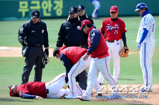 삼성과 KIA가 8일 대구 시민구장에서 시범경기를 펼쳤다. 8일부터 전국 4개 구장에서 프로야구 시범경기가 펼쳐졌다. 오는 23일까지 펼쳐지는 시범경기는 팀 간 2차전으로 각 팀 당 12경기씩을 치른다. 시범경기 첫날은 KIA-삼성(대구구장), 롯데-NC(마산구장), 두산-넥센(목동구장), SK-한화(한밭구장)가 맞붙는다. 선발로 등판한 KIA 김진우가 4회 채태인의 내야땅볼 타구에 정강이 부분을 맞았다. 고통스러운 표정으로 그라운드에 쓰러져 있는 김진우를 채태인이 다가와 걱정스러운 표정으로 바라보고 있다. 대구=송정헌 기자 songs@sportschosun.com/2014.03.08