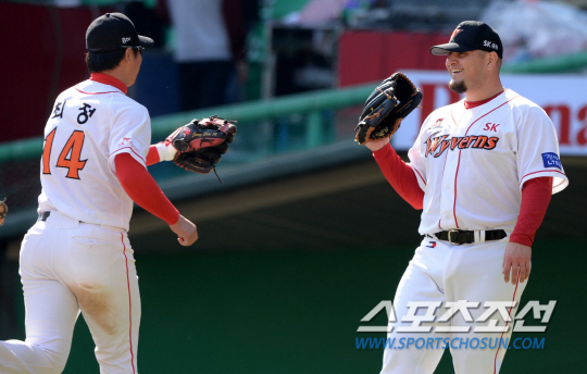 | SK와 한화의 주말 3연전 마지막날 경기가 6일 인천 문학구장에서 열렸다. 6회초 2사 SK 레이예스가 한화 정근우의 강습타구를 호수비로 처리한 3루수 최정을 보며 미소짓고 있다. 인천=허상욱 기자 wook@sportschosun.com/2014.04.06/ |
