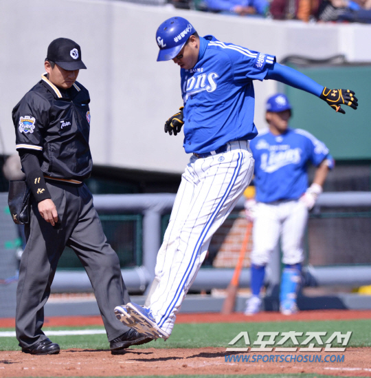 6일 오후 울산 문수야구장에서 2014 프로야구 삼성과 롯데의 경기가 열렸다. 3회초 무사 1,2루서 삼성 채태인이 중월 3점 홈런을 친 후 펄쩍 뛰며 홈 베이스를 밟고 있다. 울산=김경민 기자 kyungmin@sportschosun.com