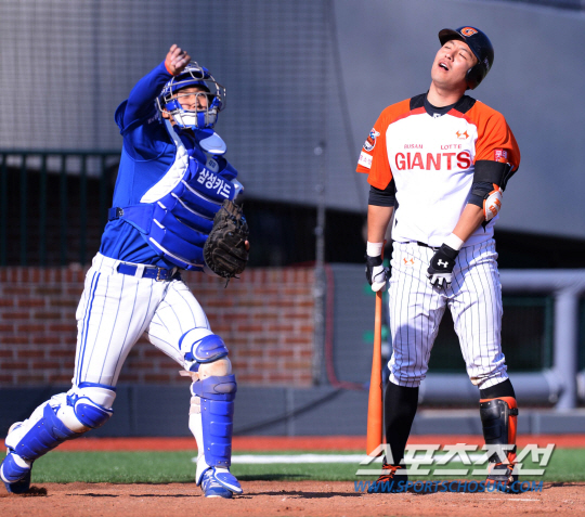 롯데는 7일 현재 5경기를 해 3승2패를 기록했다. 팀 타율 2할7푼. 24득점, 4홈런, 1도루, 득점권타율 2할5푼8리. 시즌 초반이라는 점을 분명히 감안해야 한다. 지금의 이런 타격 지표가 한 주 뒤 요동칠 수도 있다. 6일 오후 울산 문수야구장에서 2014 프로야구 삼성과 롯데의 경기가 열렸다. 7회말 선두타자로 나선 롯데 강민호가 삼진 아웃된 후 아쉬워하고 있다. 울산=김경민 기자 kyungmin@sportschosun.com / 2014.04.06.
