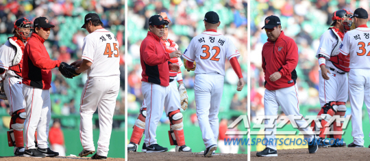 30일 인천문학구장에서 프로야구 개막 2연전 SK와 넥센의 경기가 열렸다. 개막전에서는 넥센이 타격을 앞세워 SK에 8대3으로 승리했다. SK 이만수 감독이 8회 투수를 세 명이나 교체하고 마운드를 내려왔다. 그러나 불펜이 불안한 SK는 8회 2실점을 허용하며 역전 당했다. 채병용과 박정배를 마운드에 올리고 있는 이만수의 발걸음이 무겁다. 인천=송정헌 기자 songs@sportschosun.com/2014.3.30 |