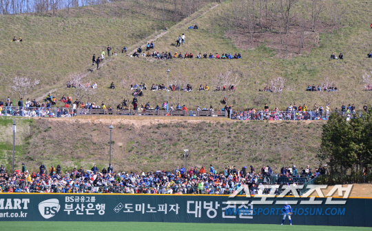 6일 오후 울산 문수야구장에서 2014 프로야구 삼성과 롯데의 경기가 열렸다. 문수야구장 바베큐존 뒤 야산에서 많은 관중들이 야구를 공짜로 관람하고 있다. 울산=김경민 기자 kyungmin@sportschosun.com / 2014.04.06. |
