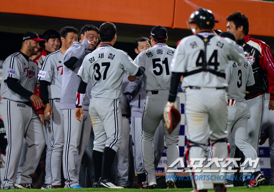 8일 부산 사직구장에서 프로야구 롯데와 LG의 주중 3연전 첫 번째 경기가 열렸다. 10회말 무사 만루의 위기를 무실점으로 넘긴 봉중근이 이닝을 마치고 마운드를 내려오며 동료들과 하이파이브를 나누고 있다. 부산=송정헌 기자 songs@sportschosun.com/2014.04.08 |