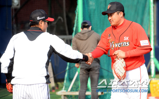 LG와 SK의 2014 프로야구 주중 3연전 첫번째 경기가 1일 잠실구장에서 열렸다. 경기 전 LG 최태원 코치와 SK 조인성과 인사를 나누고 있다. 잠실=허상욱 기자 wook@sportschosun.com/2014.04.01/ |