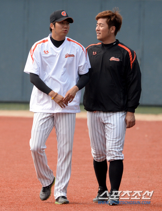 롯데와 LG의 2014 프로야구 시범경기가 18일 김해 상동구장에서 열렸다. 경기 전 롯데 장원준과 강민호가 이야기를 나누고 있다. 김해=허상욱 기자 wook@sportschosun.com/2014.03.18/ |