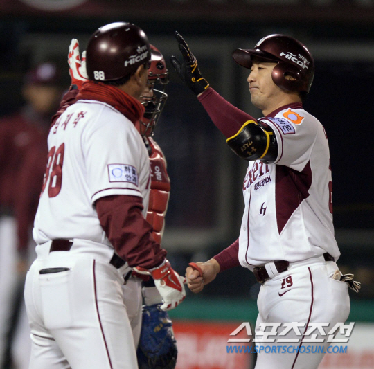 9일 오후 서울 목동 야구장에서 2014 프로야구 KIA와 넥센의 경기가 열렸다. 6회말 무사서 넥센 이택근이 좌중월 솔로홈런을 친 후 홈에서 심재학 코치와 하이파이브를 나누고 있다. 목동=김경민 기자 kyungmin@sportschosun.com / 2014.04.09. |