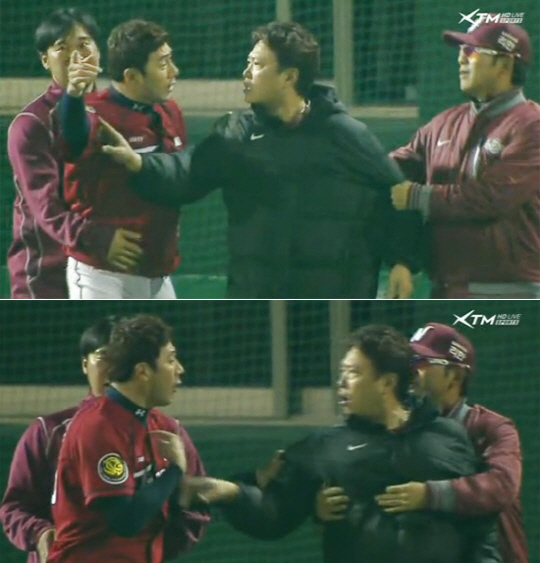 특히 히어로즈 베테랑 투수 송신영이 김주찬의 반응에 다소 흥분한 듯 목소리를 높였다. 이에 서재응이 송신영 앞에 서며 그의 행동을 자제 시켰다.