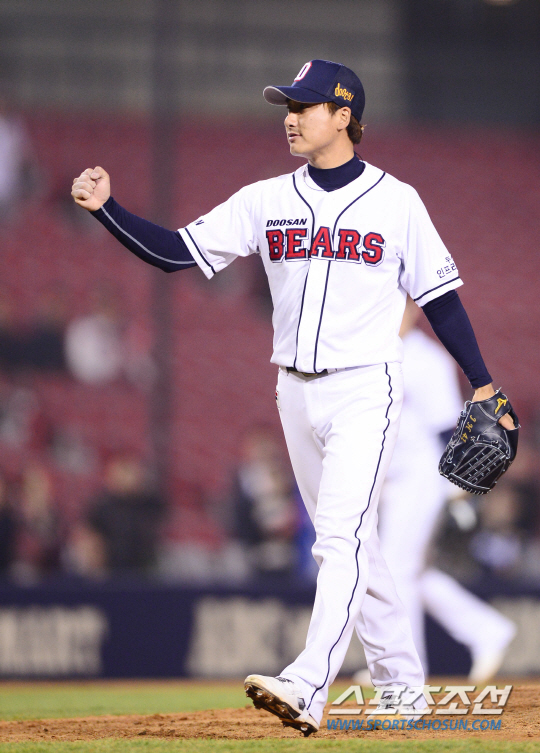 1승 1패로 맞서고 있는 두산과 SK의 2014 프로야구 경기가 10일 잠실야구장에서 펼쳐 졌다. 두산 정재훈이 7회 무사 만루 위기에서 마운드에 올라 두 타자를 가볍게 처리하고 조동화 마저 삼진으로 돌려 세우고 좋아하고 있다. 잠실=조병관기자 rainmaker@sportschosun.com