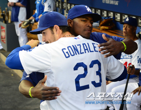 LA 다저스 류현진이 10일(한국시각) 미국 캘리포니아주 로스엔젤레스 다저스타디움에서 디트로이트 타이거즈와의 홈경기를 덕아웃에서 지켜봤다. 푸이그와 곤잘레스가 경기 전 포옹을 하고 있다. 이날 훈련에서 불펜피칭을 소화한 류현진은 오는 12일 애리조나 원정경기에 등판할 예정이다. 로스엔젤레스(미국 캘리포니아주)=정재근기자 cjg@sportschosun.com