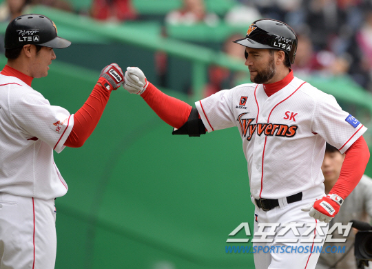 SK와 넥센이 29일 인천문학구장에서 2014프로야구 개막 경기를 펼쳤다. 작년 정규리그 3위를 차지하며 돌풍을 일으킨 넥센은 올 시즌 우승후보에 거론되고 있다. 반면, 지난시즌 7년 만에 포스트시즌 진출에 탈락한 SK는 올 시즌 부활을 꿈꾸고 있다. 3회말 2사에서 SK 루크 스캇이 넥센 밴헤켓을 상대로 우월 솔로포를 날렸다. 홈에서 이재원과 하이파이브를 나누고 있는 스캇. 인천=송정헌 기자 songs@sportschosun.com