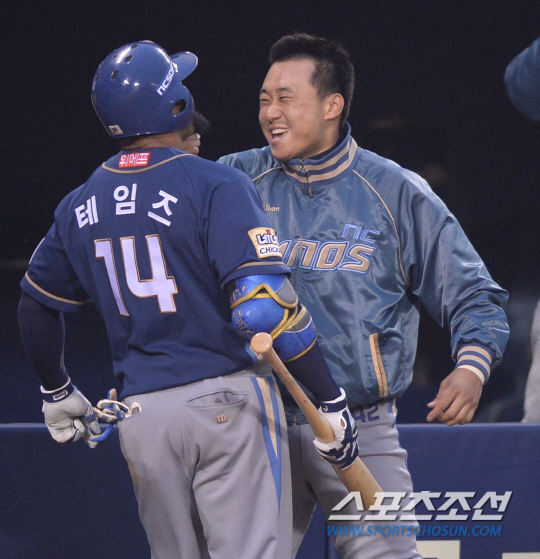 12일 오후 서울 잠실야구장에서 2014 프로야구 NC와 LG의 경기가 열렸다. 7회초 2사서 좌중월 솔로 홈런을 친 NC 테임즈가 덕아웃 앞에서 김태군과 기뻐하고 있다. 잠실=김경민 기자 kyungmin@sportschosun.com