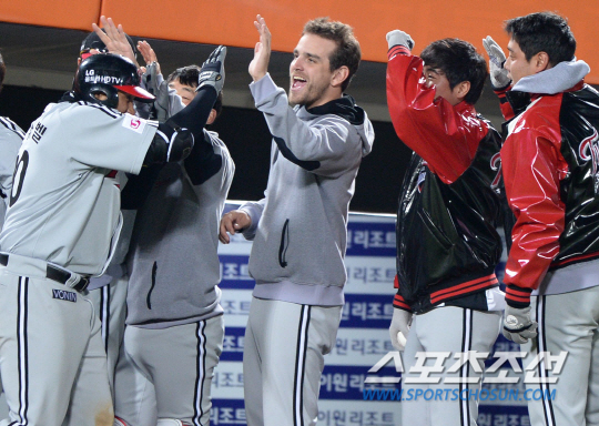 10일 부산 사직구장에서 프로야구 롯데와 LG의 주중 3연전 마지막 경기가 열렸다. LG 조쉬벨이 9회 동점 솔로홈런을 날렸다. 덕아웃에서 동료들과 하이파이브를 나누고 있는 조쉬벨. 부산=송정헌 기자 songs@sportschosun.com/2014.04.10