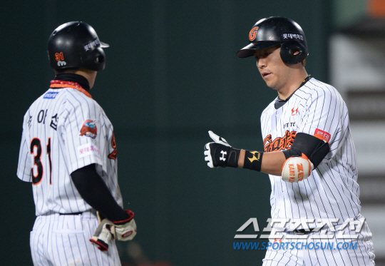 롯데와 LG가 9일 부산 사직구장에서 주중 3연전 두 번째 경기를 펼쳤다. 전날 첫 번째 경기는 12회 연장승부 끝에 2대2로 무승부를 기록했다. 4회 2사 2루에서 롯데 강민호가 LG 우규민을 상대로 투런포를 날렸다. 홈에서 손아섭과 하이파이브를 나누고 있는 강민호. 부산=송정헌 기자 songs@sportschosun.com/2014.04.09