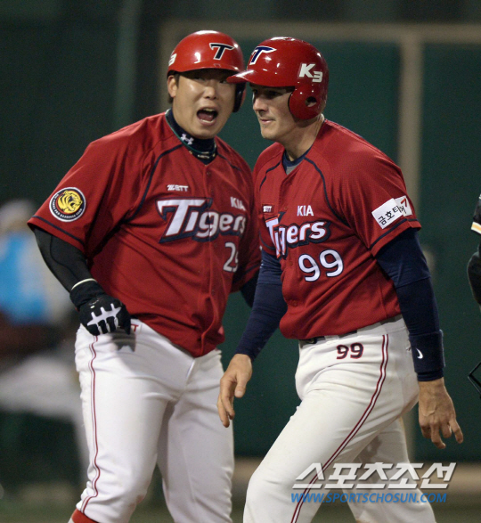 9일 오후 서울 목동 야구장에서 2014 프로야구 KIA와 넥센의 경기가 열렸다. 7회초 2사 2,3루서 KIA 이종환의 적시타 때 2루주자 필이 홈에서 세이프된 후 나지완과 환호하고 있다. 목동=김경민 기자 kyungmin@sportschosun.com / 2014.04.09.