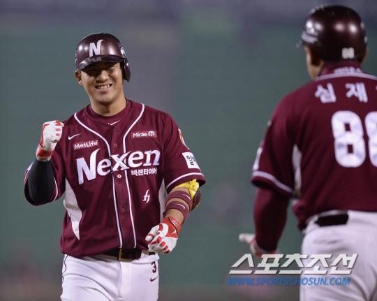 15일 오후 서울 잠실야구장에서 2014 프로야구 넥센과 LG의 경기가 열렸다. 연장 11회초 무사 2루서 넥센 김민성이 역전 적시타를 친 후 심재학 코치와 환하게 웃고 있다. 잠실=김경민 기자 kyungmin@sportschosun.com