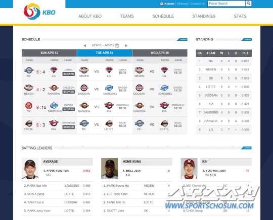 한국야구위원회(KBO)는 16일부터 홈페이지(www.koreabaseball.com)에 영문 서비스를 시작한다.