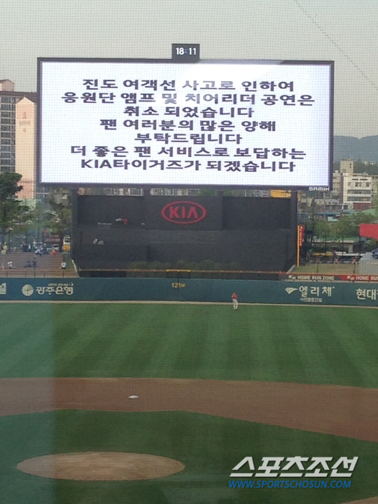 이에 따라 KIA 역시 이날 치어리더 응원과 앰프 응원없이 경기를 치렀다. 또 이날 예정됐던 힙합 가수 '로꼬'의 미니 콘서트도 취소했다. 또 경기 시작전 전광판을 통해 이같은 내용을 관중에게 알렸다.