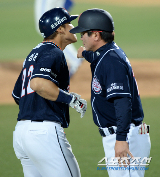 삼성과 두산의 주중 3연전 두번째날 경기가 16일 대구 시민구장에서 열렸다. 6회초 1사 두산 홍성흔이 삼성 장원삼의 투구를 받아쳐 우측담장을 넘어가는 솔로홈런을 날렸다. 홈인하며 전형도 3루 코치의 축하를 받는 홍성흔. 홍성흔은 4회에도 솔로홈런을 날려 올시즌 첫 홈런을 기록했다. 대구=허상욱 기자 wook@sportschosun.com/2014.04.16/