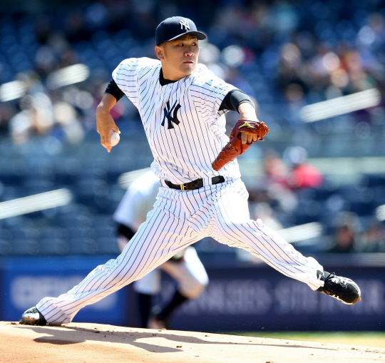 | 뉴욕 양키스의 일본인 투수 다나카 마사히로가 17일(한국시각) 시카고 컵스를 상대로 선발 등판해 1회 투구를 하고 있다. 이날 다나카는 8이닝 동안 2개의 안타만을 내주고 무실점으로 막는 호투로 시즌 2승째를 따냈다. ⓒAFPBBNews = News1 |