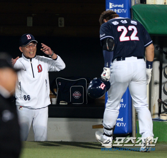 삼성과 두산의 주중 3연전 두번째날 경기가 16일 대구 시민구장에서 열렸다. 4회초 선두타자로 나선 두산 홍성흔이 삼성 장원삼의 투구를 받아쳐 좌측담장을 넘어가는 솔로홈런을 날렸다. 홈인하는 홍성흔을 향해 밝은 미소로 기뻐하는 송일수 감독의 모습. 대구=허상욱 기자 wook@sportschosun.com