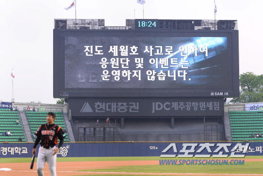 마치 아마추어 야구장 같았다. 음악이 완전히 사라졌다. 치어리더도 없다. 무응원 경기. 홈팀 두산의 응원단상도, 원정팀 롯데의 응원단상도 텅텅 비었다. 2014 프로야구 두산베어스와 롯데자이언츠의 경기가 18일 잠실야구장에서 열렸다. 전광판에 "진도 세월호 사고로 인해 응원단 및 이벤트가 운영되지 않는다" 는 문구가 안내되고 있다. 잠실=최문영 기자 deer@sportschosun.com /2014.04.18/