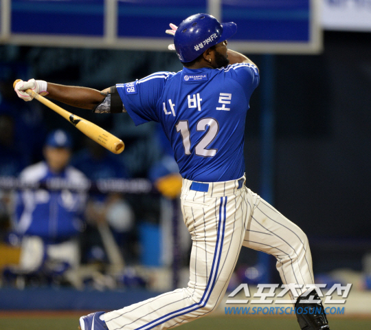 NC와 삼성의 주말 3연전 첫번째 경기가 18일 창원 마산구장에서 열렸다. 3회초 2사 삼성 나바로가 NC 이재학의 투구를 받아쳐 좌측담장을 넘어가는 솔로홈런을 날리고 있다. 창원=허상욱 기자 wook@sportschocun.com/2014.04.18/ |