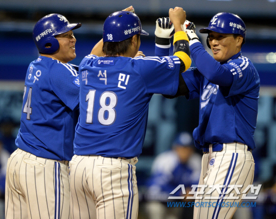 NC와 삼성의 주말 3연전 첫번째 경기가 18일 창원 마산구장에서 열렸다. 3회초 2사 1,2루 삼성 이승엽이 NC 이재학의 투구를 받아쳐 우측담장을 넘어가는 역전 3점홈런을 날렸다. 홈인하며 선행주자 최형우, 박석민과 하이파이브를 하는 이승엽. 창원=허상욱 기자 wook@sportschocun.com/2014.04.18/