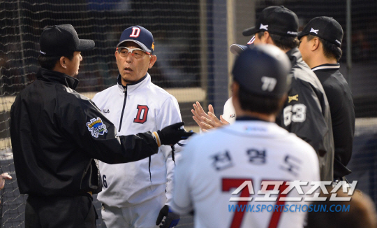 2014 프로야구 두산베어스와 롯데자이언츠의 경기가 18일 잠실야구장에서 열렸다. 롯데 2회초 1사 만루 정훈의 내땅때 두산 포수 양의지가 3루주자 문규현을 포스아웃 시도했으나 베이스 터치를 하지 않아 세이프 되었다. 그러나 이 장면이 기록원과 심판의 착오로 아웃으로 기록되어 후속타자 손아섭의 내땅 아웃으로 이닝이 종료되었다. 그후 경기가 중단되고 기록을 수정해 2사 2,3루 최준석 타석의 상황으로 다시 돌아가 경기가 재개되는 해프닝이 벌어졌다. 이에 송일수 두산 감독이 심판들의 설명을 듣고 있다. 잠실=최문영 기자 deer@sportschosun.com