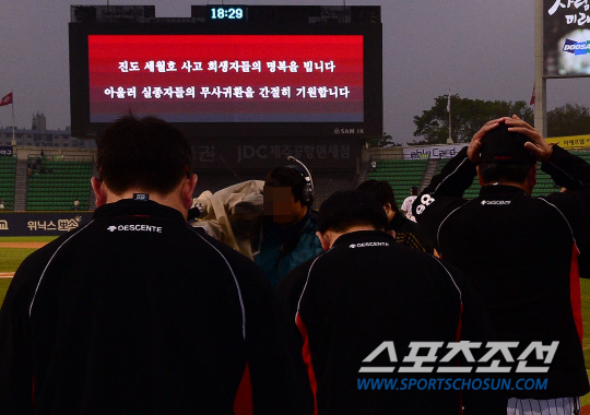 사고 이틀째인 17일 경기 전 만난 LG 김기태 감독은 "오늘은 꼭 필요한 얘기가 아니라면 취재진 미팅을 짧게 줄였으면 한다"고 말했다. 긴 연패에 빠져 그런 것으로 오해할 수도 있겠지만 김 감독 스타일상 그런 의미의 말은 절대 아니었다. 승패에 관계 없이 항상 유쾌한 모습을 보여주는 김 감독이다. 김 감독이 이런 요청을 한 것은 세월호 사고 때문이었다. 김 감독은 "어제 경기 후 뉴스를 보는데 정말 가슴이 아팠다. 한 학생이 어머니에게 보낸 메시지를 보는 순간에는 눈물이 나왔다"며 "오늘만큼은 숙연하게 경기를 치르고 싶다"고 말했다. 사고를 당한 고교 2년생과 비슷한 또래의 아들을 둔 김 감독이다.