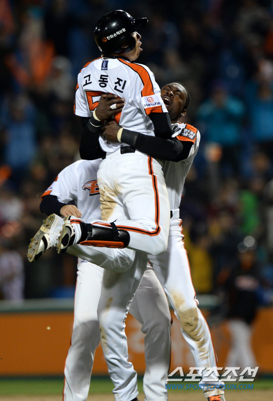 한화와 LG의 주말 3연전 두번째 경기가 19일 대전구장에서 열렸다. 한화가 10회말 무사 2루 터진 고동진의 끝내기 안타로 8대7 승리를 거뒀다. 동료들과 기쁨을 나누는 고동진. 대전=허상욱 기자 wook@sportschocun.com/2014.04.19/ |