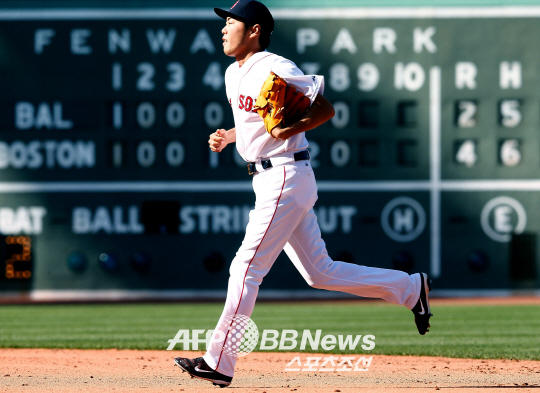 보스턴 레드삭스의 마무리 투수 우에하라 고지가 20일(한국시각) 볼티모어 오리올스전 9회 불펜에서 마운드로 이동하고 있다. ⓒAFPBBNews = News1 |