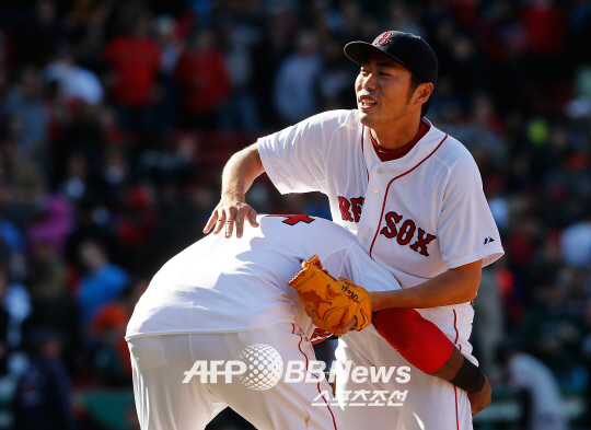| 보스턴 레드삭스의 간판 타자 데이비드 오티즈가 20일(한국시각) 볼티모어 올리올스전 9회 등판해 팀 승리를 지킨 우에하라를 들어올리며 축하하고 있다. ⓒAFPBBNews = News1 |