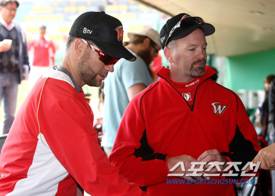| SK 외국인 타자 루크 스캇은 개인 트레이너를 고용, 한국에서도 몸관리를 받고 있다. 지난 18일 입국한 존 캐리 트레이너가 20일 KIA전을 앞두고 스캇과 이야기를 나누고 있다. 사진제공=SK 와이번스 |
