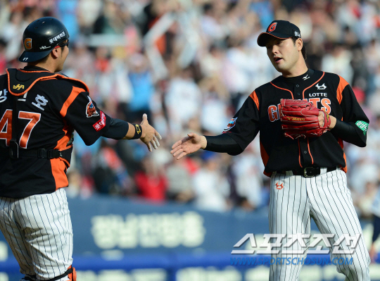 2014프로야구 롯데와 두산의 경기가 20일 잠실구장에서 열렸다. 롯데가 3-2로 역전한 9회말 정대현이 마운드에 올라 승리를 지킨 후 강민호 포수와 악수를 하고 있다. 잠실=정재근 기자 cjg@sportschosun.com/2014.04.20/ |