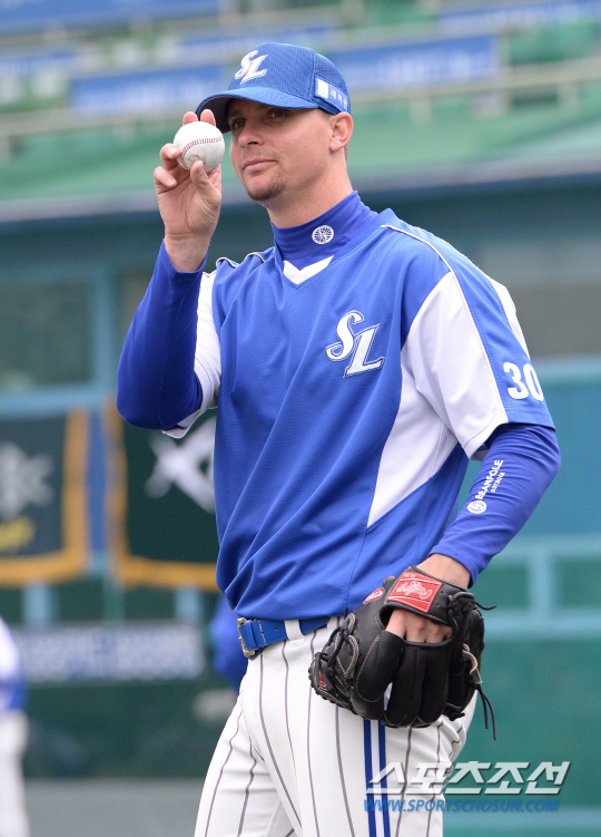 삼성과 SK가 13일 대구시민구장에서 주말 3연전 마지막 경기를 펼쳤다. SK가 삼성에 시리즈 2승으로 앞서있다. 1군에 합류한 마틴이 밴덴헐크와 함께 캐치볼 훈련을 하고 있다. 밝은 표정으로 볼을 던지는 마틴. 대구=송정헌 기자 songs@sportschosun.com/2014.04.13