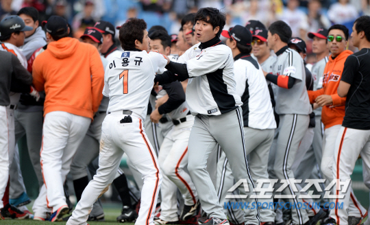 여기까지는 괜찮았다. 문제는 8회 발생했다. 8회말 1사 주자없는 상황 볼카운트 2B0S 상황서 또다시 정근우의 몸쪽으로 정찬헌의 직구가 날아들었다. 여지 없었다. 느낌이 달랐다. 1루측 덕아웃 한화 선수들이 먼저 그라운드로 뛰쳐나왔고, LG 선수들도 달려나와 대치 상황을 만들었다. 한화는 김태균, 이양기 등이 격분해 선두에 서 몸싸움을 벌였다. LG 선수들은 정근우를 향해 고함을 쳤다. 선수들이 대치 중인 상황에서 투수 우규민이 정근우에게 다가가 거세게 항의를 했다.